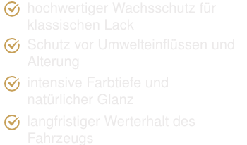 Eine hochwertige Wachsschicht schützt den Lack vor Umwelteinflüssen und unterstützt gleichzeitig die natürliche Tiefe und Wärme des Lacks.